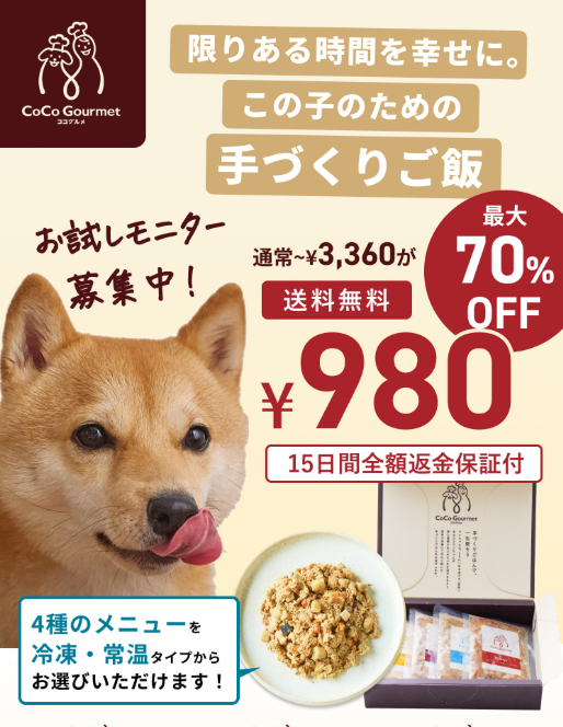| ココグルメ | 1食あたり約450円〜 | 獣医師監修・手作り冷凍・国産食材 | 全犬種・全年齢 | 初回お試しセット有 | 冷凍便・定期配送 |